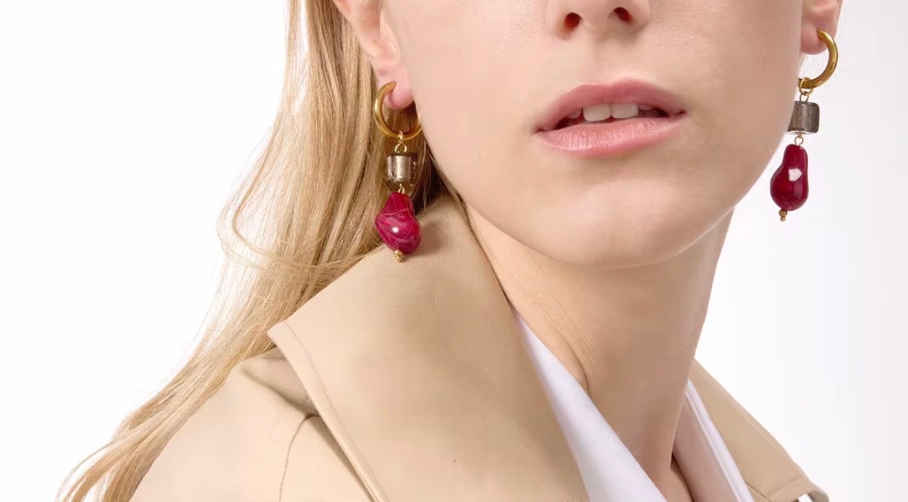 Bold contrast meets modern elegance in the Crimson Noir Drop Earrings. Designed with polished gold huggie hoops, smoky gray geometric accents, and rich crimson resin drops, these earrings strike the perfect balance between artistry and sophistication.
