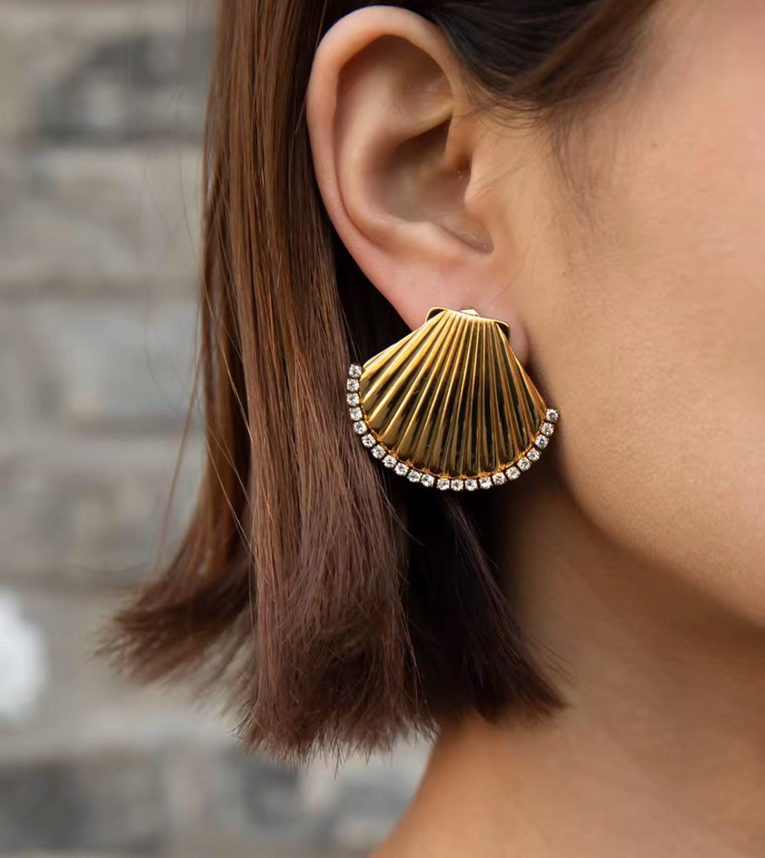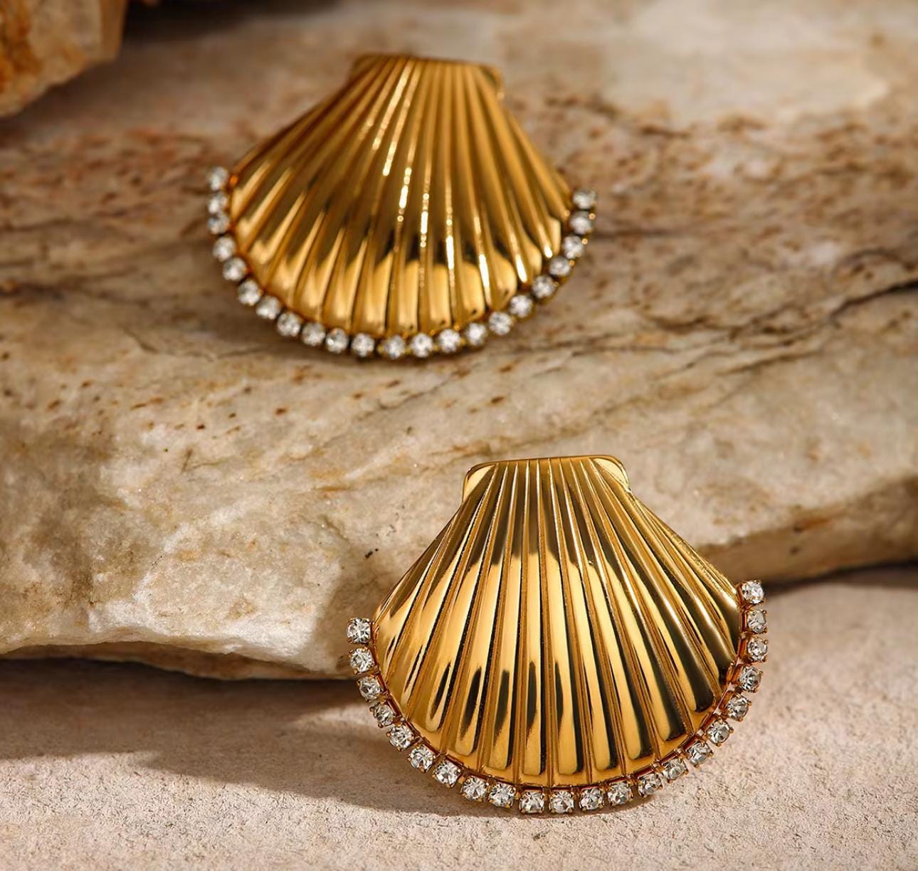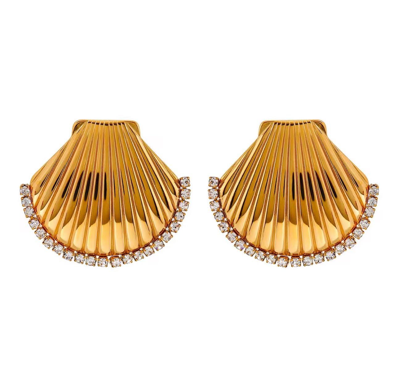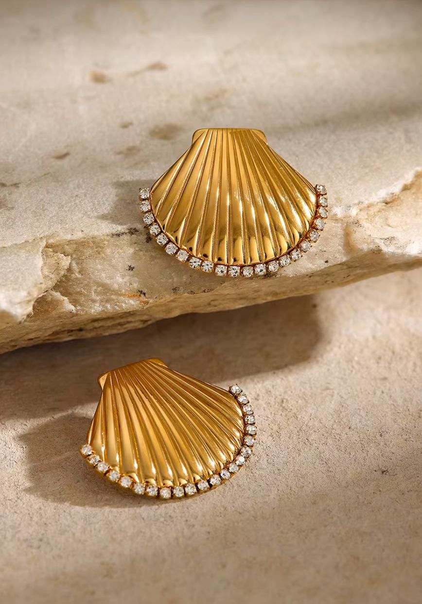 These shell-shaped stud earrings bring a touch of seaside elegance to your style. Crafted from high-quality stainless steel and plated in radiant gold, they feature a finely ribbed shell design adorned with a sparkling row of zirconia stones along the curved edge. Durable, tarnish-resistant, and eye-catching, they’re perfect for adding a chic, nautical-inspired detail to any outfit. Measurements: • Height: 3.14 cm (1.24 in) • Width: 3.64 cm (1.43 in) • Material: Stainless Steel • Plating: Gold • Stones: Zirconia