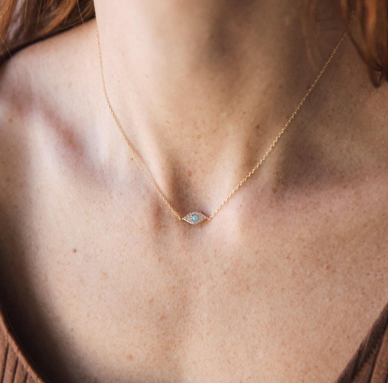 Opal Eye Necklace Carry a little good luck wherever you go with this elegant and symbolic piece. Designed with a delicate evil eye charm—believed to protect against negative energy—this necklace adds both meaning and sparkle to your everyday look. The shimmering CZ diamond accents and luminous opal center make it a subtle statement that’s full of intention. • Crafted from high-quality solid Stainless steel• 18K Gold finish • Features a ~5mm pave evil eye charm with a ~1.5mm CZ opal stone • Comes on an adjustable cable chain (16 to 18 inches)